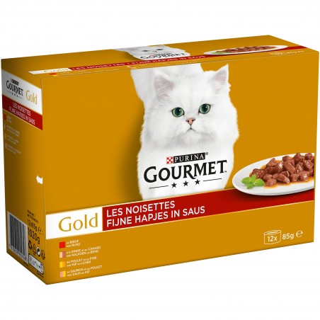 GOURMET® Gold a donc créé Les Noisettes, toute une gamme de succulents menus pour chat qui éveilleront l’appétit de votre chat et raviront son palais délicat à chaque repas. De tendres morceaux au Boeuf, au Saumon ou autres succulentes saveurs, mijotés et nappés d'une sauce onctueuse pour offrir à votre chat le plaisir d'un repas riche en saveurs et en goût.