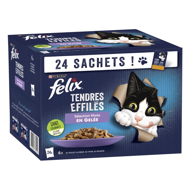 Chaque recette est composée d'ingrédients de qualité et contient de tendres effilés enrobés d’une gelée qui raviront votre chat à tous les repas ! Ces repas sont une source d’acides gras Oméga-6 avec le juste équilibre de vitamines pour aider votre chat à rester en pleine forme et à être prêt pour toujours plus de malice ! Ils contiennent tous les bienfaits nutritifs pour satisfaire 100% des besoins quotidiens de votre chat, selon les rations journalières recommandées sur l'emballage.