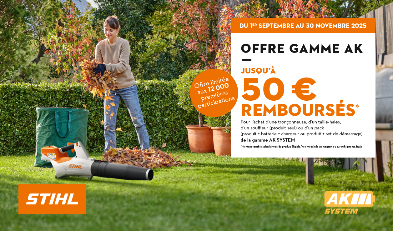 Du 1er septembre au 30 novembre 2025 inclus, équipez-vous avec l’offre exceptionnelle AK SYSTEM ! Pour l’achat d’une tronçonneuse, d’un souffleur ou d’un taille-haies de la gamme de notre sélection, profitez de 50€ remboursés sur un pack complet (machine + batterie + chargeur), ou 30€ remboursés sur une machine seule.