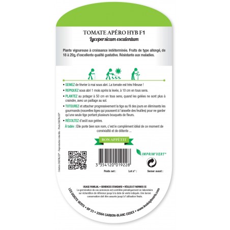 La Tomate Apéro hyb. F1 est une plante vigoureuse à croissance indéterminée. Fruit de type allongé, de 18 à 20 g, d’excellente qualité gustative. Résistante aux maladies.