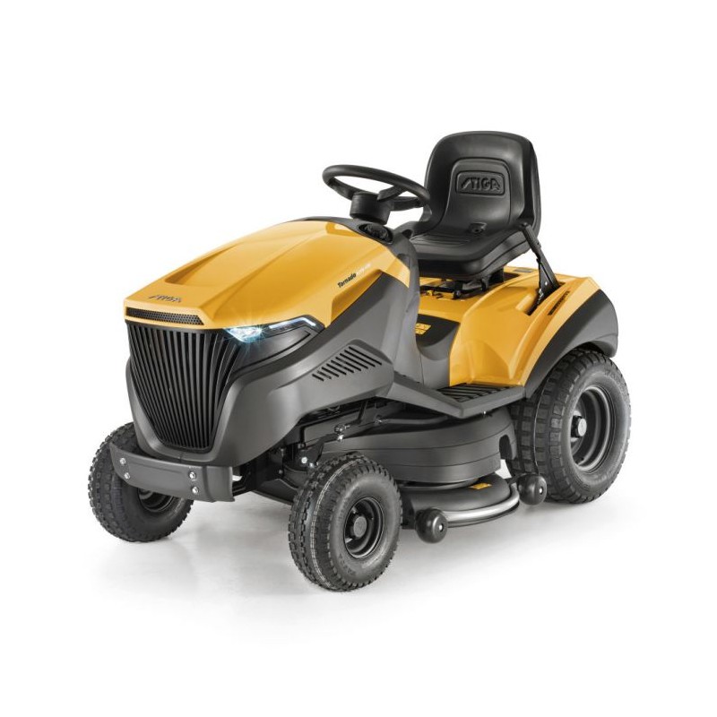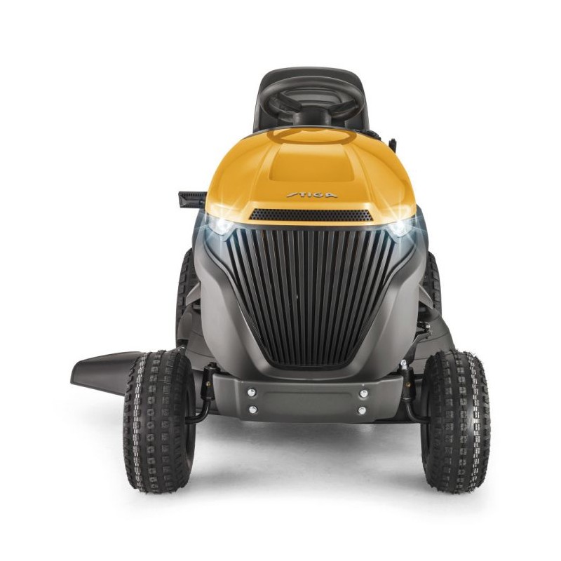 Tracteur-tondeuse à double lame robuste et résistante de 108 cm propulsé par un moteur bicylindre ST 600 de grande cylindrée (586 cm³) et offrant les modes éjection latérale et mulching de série. Idéal pour les herbes folles sur des pelouses allant jusqu’à 7 000 m². Le kit mulching, le chargeur de batterie et l'attelage de remorque sont disponibles séparément.