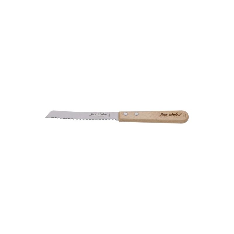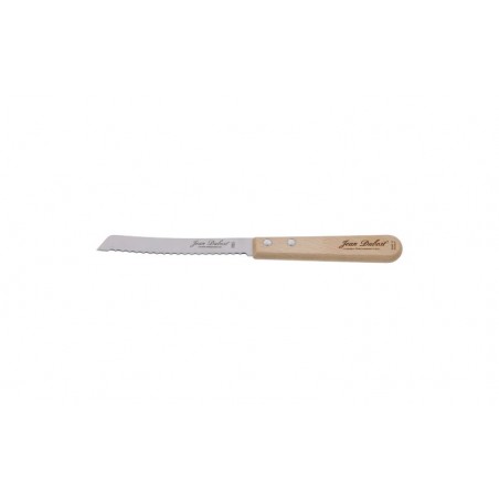 Couteau à tomates Jean Dubost, lame demi-soie d'une longueur de 11 cm et d'épaisseur 1.2 mm, en acier inoxydable français de haute qualité. Manche tradition 2 rivets en hêtre naturel issu de forêts françaises avec sérigraphie à l'effigie de la marque Jean Dubost. 100% conçu et fabriqué à Thiers, France. 100% emploi local préservé. 100% savoir-faire français traditionnel. 100% circuit court, impact carbone limité. Modèle déposé.