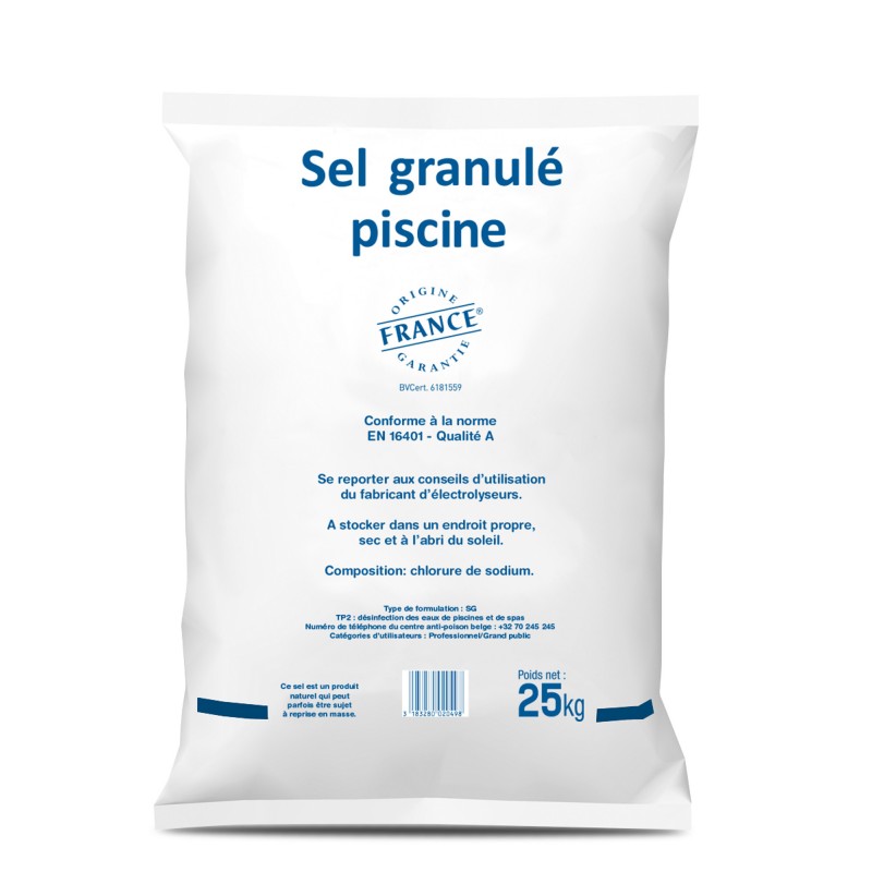 | Norme | EN 16401, Qualité A - Sel raffiné de haute pureté pour électrolyseur de piscine |