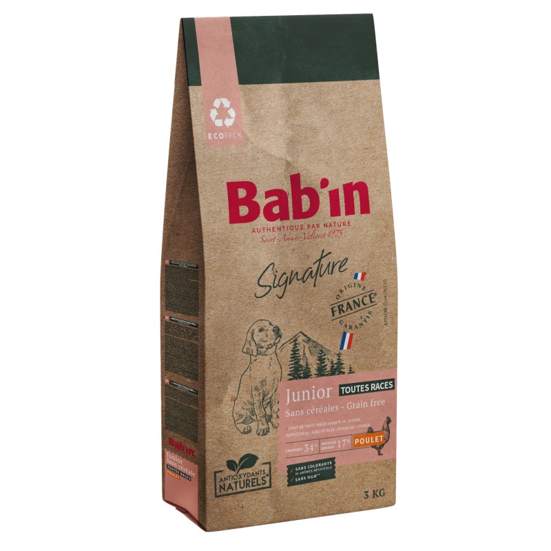 BAB’IN SANS CÉRÉALES JUNIOR, riche en poulet, répond aux besoins des chiots intolérants aux céréales et au gluten. Son taux élevé de protéines d'origine animale de haute qualité (73%, poulet, truite et œuf), combiné à des sources alternatives de glucides (pomme de terre et légumineuses) et associé à un complexe de prébiotiques (FOS & MOS) contribue à la sécurité digestive. Il assure une croissance harmonieuse avec un apport énergétique et minéral contrôlé. Il favorise également le soutien articulaire grâce au complexe de glucosamine et chondroïtine.