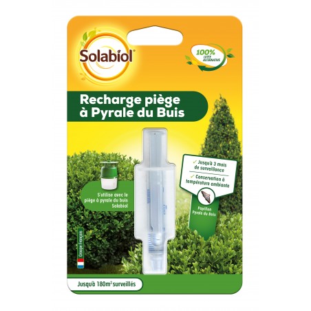 La recharge Pyrale du Buis est adaptée spécifiquement au Piège à Pyrale du Buis Solabiol et permet d’attirer et de piéger les papillons mâles permettant ainsi une surveillance qui sert à déterminer le stade de développement, la période d'activité des insectes et ensuite le niveau d'infestation. Elle permet de surveiller pendant 3 mois jusqu’à 180 m² dans le cas d’une infestation normale. Elle se conserve à température ambiante entre 15°C à 25°C.