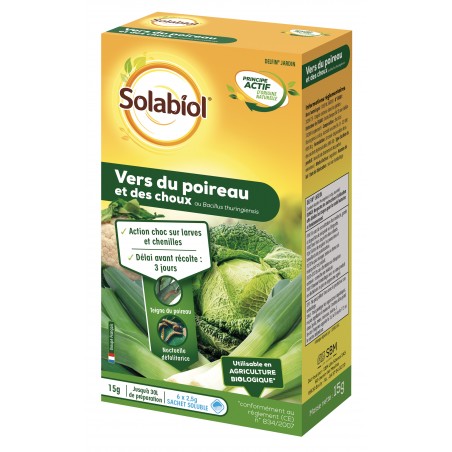 Vers du poireau et des choux Solabiol contient un micro-organisme : le Bacillus thuringiensis. Cet insecticide agit par ingestion. Son mode d'action provoque chez les larves de lépidoptères (les chenilles) un arrêt rapide et définitif de leur nutrition et entraîne donc leur disparition. Son efficacité dépend de la quantité de produit ingéré par les ravageurs. La qualité de la pulvérisation est donc un facteur clé de la réussite du traitement : elle doit être homogène.