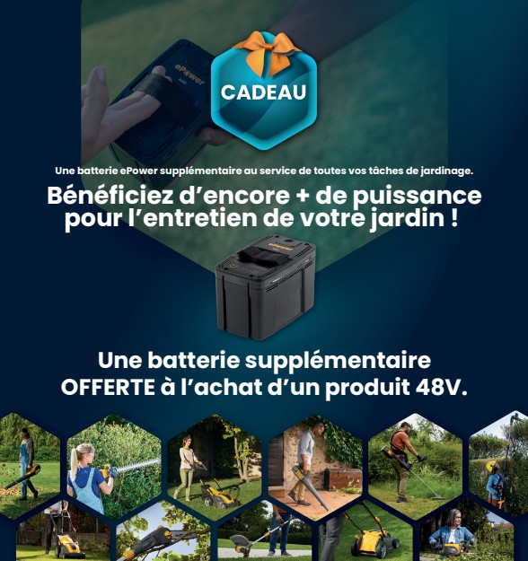 Du 1er avril au 31 mai 2026 inclus, profitez d’une batterie supplémentaire de 48 V offerte pour tout achat d'un produit à batterie 48 V.