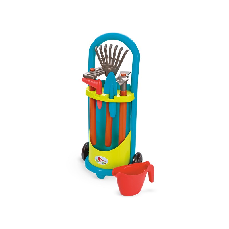 LES OUTILS DU JARDINIER : ce chariot contient 1 râteau, 1 ramasse-feuille, 1 binette, 1 plantoir, 1 pelle à plantation.