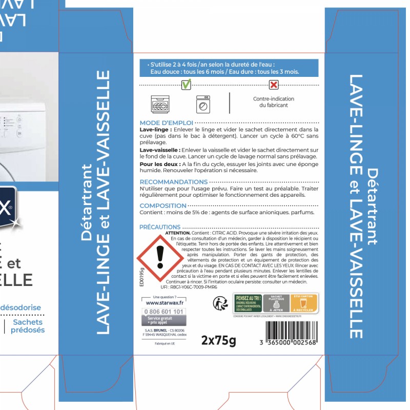 NETTOYANT DETARTRANT LAVE LINGE 2X75G - STARWAX