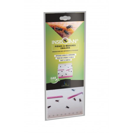 INSECTAN Pièges à mouches englués contient 6 manchettes engluées (dimensions : L 300 x l 110 mm). Ce pack de 6 pièges prêts à l’emploi est idéal pour capturer les mouches dans les dépendances, les hangars, les logements d’animaux, les bâtiments d’élevage... Fonctionne efficacement en toutes saisons. Agit jour et nuit, pendant 6 à 8 semaines ou jusqu’à saturation.