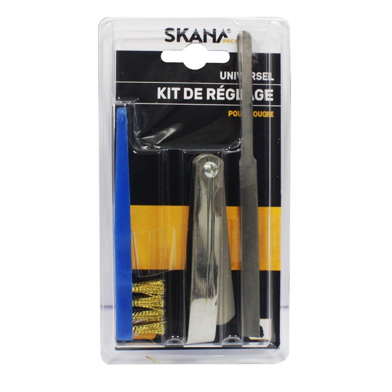Kit de réglage pour bougie d'allumage. Comprenant 1 jeu de cales d'épaisseur, 1 lime plate et 1 brosse de nettoyage.