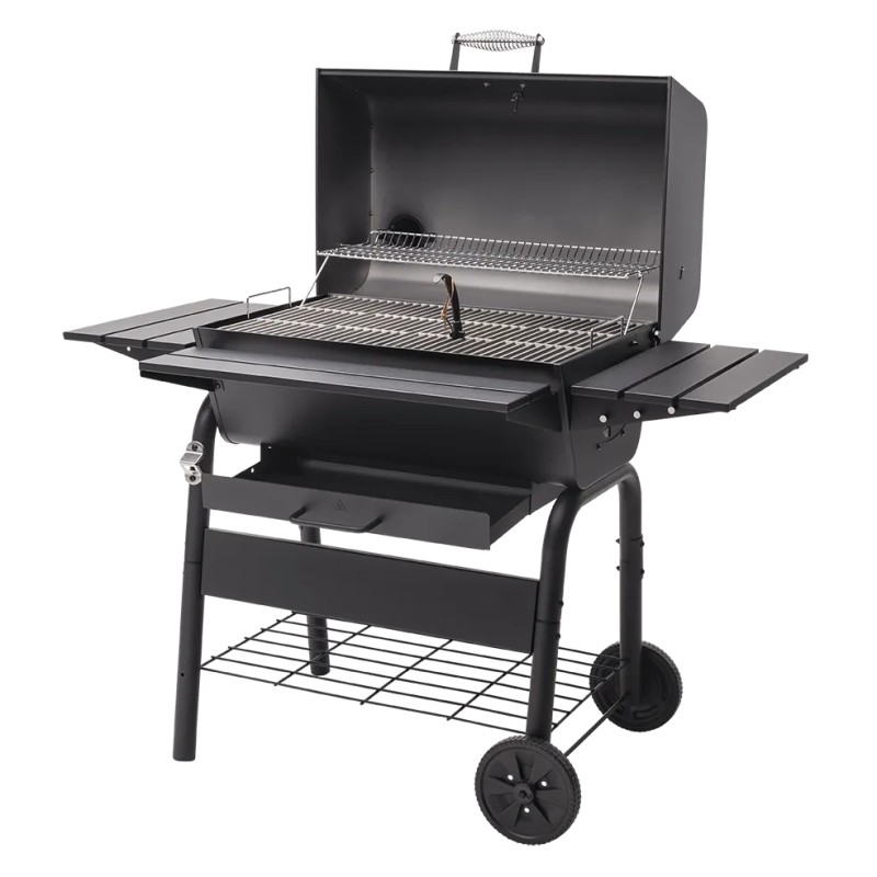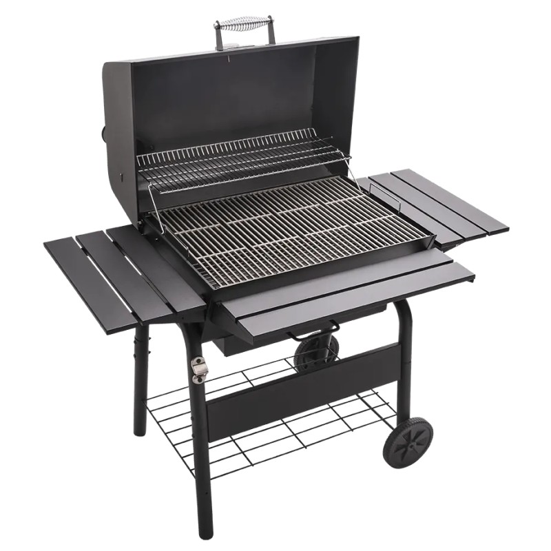 - Large tablette pour un maximum d'espace et de praticité :  La tablette latérale est munie de crochets pour garder vos accessoires à portée de main, la tablette inférieure vous offre également une surface de travail et de rangement supplémentaire. Le Charcoal L est doté d'une tablette frontale supplémentaire facilement accessible.