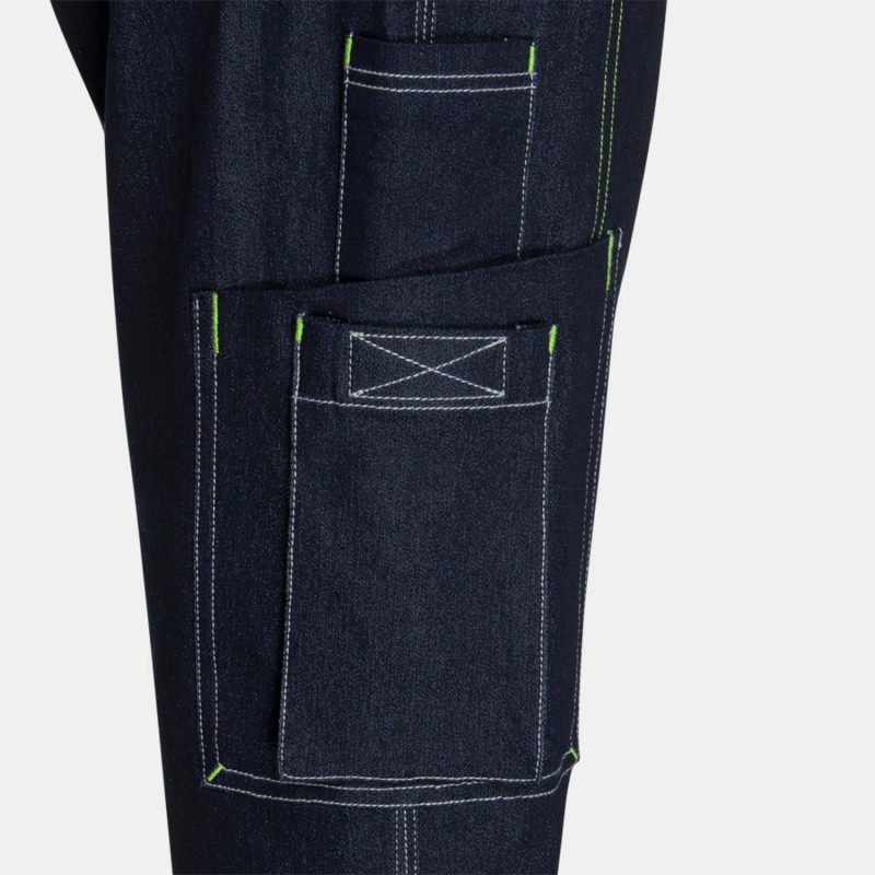 - 9 poches : 1 poche plaquée, 1 poche stylos, 2 poches cavalières, 2 poches plaquées avec soufflets, 2 poches plaquées, 1 poche mètre pliant, 1 porte-badge