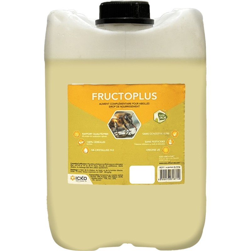 Ce sirop de nourrissement Fructoplus est un aliment complémentaire pour les abeilles issu du blé et du maïs. Sans conservateur et sans amidon, il ne cristallise pas et entraîne peu de pillage. Jerrican de 14 kg.