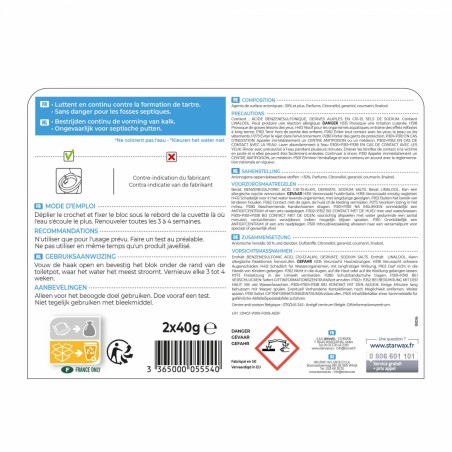 Les blocs eau bleue libèrent à chaque chasse une dose de produit pour colorer l’eau, nettoyer, désodoriser et lutter en continu contre la formation de tartre sur la cuvette. Les blocs eau bleue s’utilisent toutes les 3 à 4 semaines selon le nombre d’habitants.