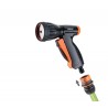 Pistolet multifonction avec nouvelle poignée anatomique caoutchoutée et mécanisme commode antérieur à bouton pratique pour l’ouverture et la fermeture du débit. Manette arrière de réglage du débit d’eau. Bague caoutchoutée avec fonction antichoc, ouvrante pour inspection et nettoyage. En tournant la bague on obtient quatre jets différents: douche, concentré, diffusé en éventail ou nébulisé.