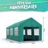 Tissu PE imperméable 140 g/m². Portes zippées et fenêtres enroulables. Protège du vent, de la pluie, des rayons UV. Avec 1 ensemble de cadre en acier, 2 couvertures de toit, 4 parois latérales (2 avec fenêtre + 2 avec fermeture éclair), 8 ensemble de piquets et de cordes. Tubes Ø 38 mm.