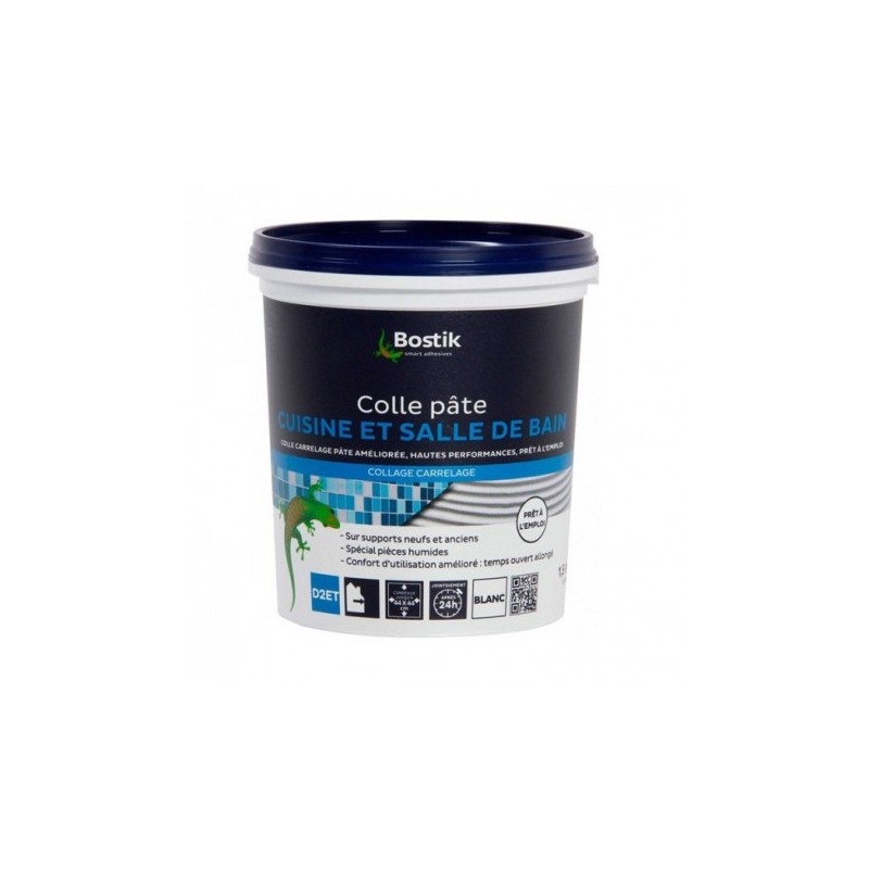 Colle en pâte pour carreaux jusqu'à 33 x 33 cm. Destination mur intérieur en pièce humide. Sur support neuf (plâtre, mortier, béton, bois...) et sur carrelage standard.