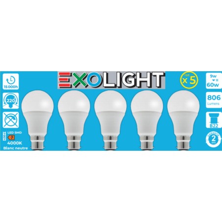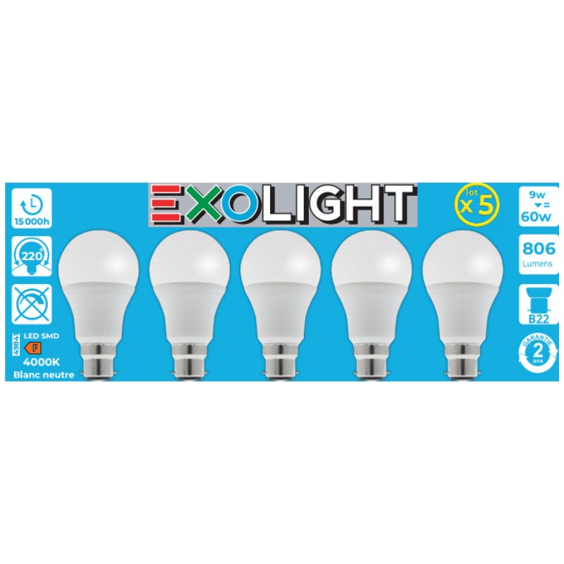 AMPOULE LED SMD STD OPALE 4KK 9W 806L B22 X5 - EXOLIGHT