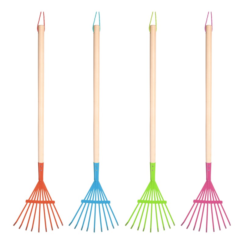 Ce râteau à feuilles aux couleurs gaies est indispensable pour le petit jardinier. Le râteau à feuilles a une boucle de suspension pour un rangement facile.