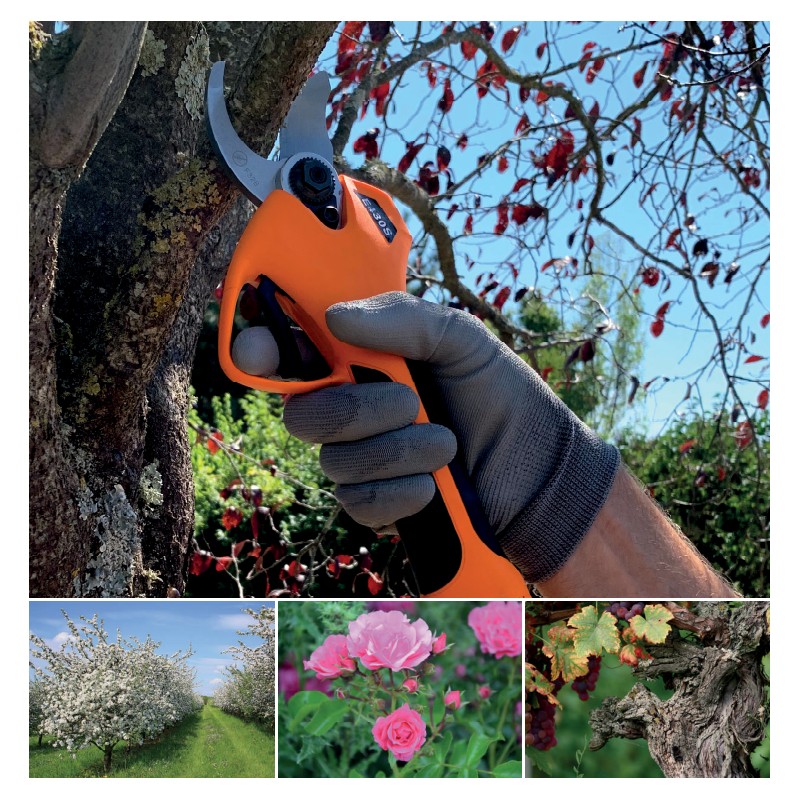 Sécateur électrique sur batterie, idéal pour des coupes sans effort. Batterie déportée (Harnais porte batterie et porte sécateur fourni dans le coffret) afin de réduire l'effort.
