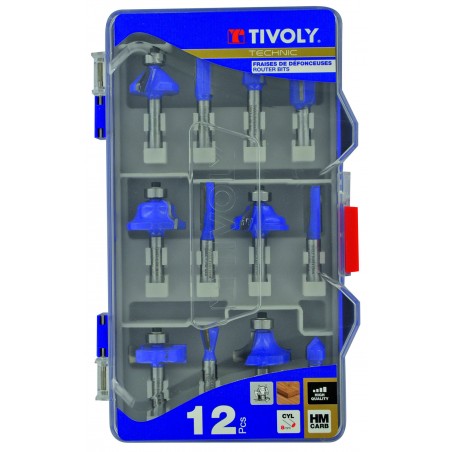 COFFRET 12 FRAISES DE DEFONCEUSES FORMES ASSORTIES, LAME CARBURE ET QUEUE 8MM - TIVOLY