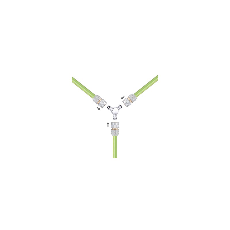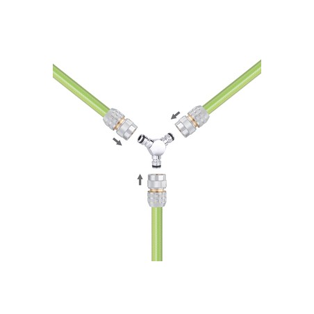 Déviateur à 3 voies en laiton chromé. Pour dédoubler la ligne d’arrosage et amener l’eau dans deux points différents. Trois tuyaux avec raccords automatiques aux extrémités sont raccordés.