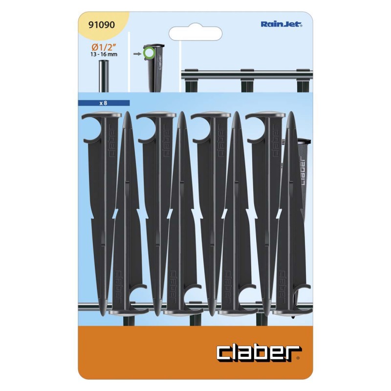 Lot de 8 piquets qui permettent de fixer fermement le tuyau 1/2” (13-16 mm) au sol. Blister de 8 pièces.
