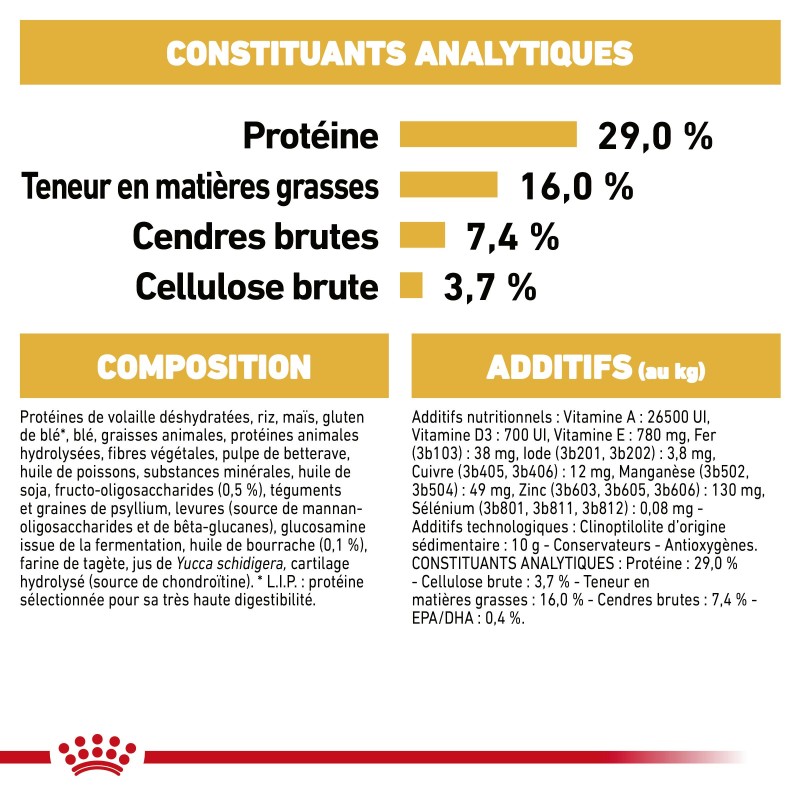 Protéines de volaille déshydratées, riz, maïs, gluten de blé*, blé, graisses animales, protéines animales hydrolysées, fibres végétales, pulpe de betterave, huile de poissons, substances minérales, huile de soja, fructo-oligosaccharides (0,5 %), téguments et graines de psyllium, levures (source de mannan-oligosaccharides et de bêta-glucanes), glucosamine issue de la fermentation, huile de bourrache (0,1 %), farine de tagète, jus de Yucca schidigera, cartilage hydrolysé (source de chondroïtine). *L.I.P. : protéine sélectionnée pour sa très haute digestibilité.
