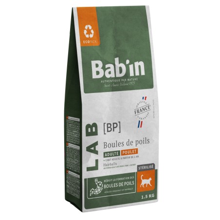 BAB’IN LAB CHAT ADULTE BOULES DE POILS, riche en poulet, est formulé pour éliminer les poils ingérés par le chat et freiner la formation de boules de poil. Il participe à l’élimination de la plaque dentaire et stimule le transit intestinal. La formule spécifique de cet aliment participe également au fonctionnement optimal du système urinaire. Il lui apporte tous les éléments nutritionnels nécessaires tout en respectant ses sensibilités. Convient au chat stérilisé et non stérilisé.