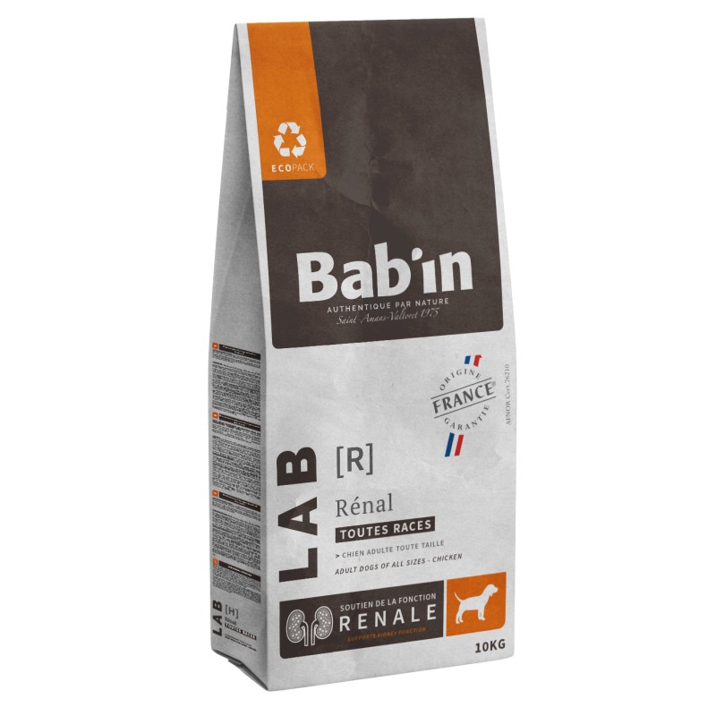 BAB’IN LAB ADULTE RENAL est un aliment diététique complet pour chiens destiné à soutenir la fonction rénale lors d’insuffisance rénale. Recommandations : Il est recommandé de consulter un vétérinaire avant utilisation ou prolongation de la période d’utilisation. Au départ, distribuer l’aliment jusqu’à 6 mois.