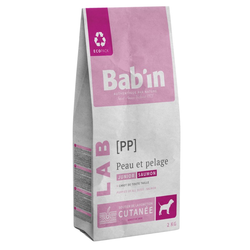 BAB’IN LAB JUNIOR PEAU & PELAGE favorise une peau saine et un pelage brillant grâce à son taux élevé de saumon (26%), de céréales hypoallergéniques (20% de riz) et d’oméga 3&6. Complété par des graines de bourrache, de la levure de bière (vitamine B) et de la méthionine (acides aminés soufrés), il est un aliment de choix pour les chiots ayant une sensibilité cutanée. Il contribue à une digestion optimale et favorise le soutien articulaire grâce à son complexe de glucosamine et chondroïtine.