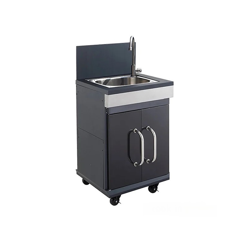 Avec l'évier de la gamme Fidgi, vous pourrez agrémenter votre barbecue (Fidgi 3 ou 4) d'une zone de rinçage qui vous permettra de laver vos aliments avant de les passer au barbecue. Le rangement inférieur avec portes pourra, lui, servir d'espace de stockage pour vos ustensiles ou assaisonnements. L'évier, tout comme le barbecue, est aussi déplaçable à l'infini grâce à ses 4 roues multidirectionnelles avec freins.