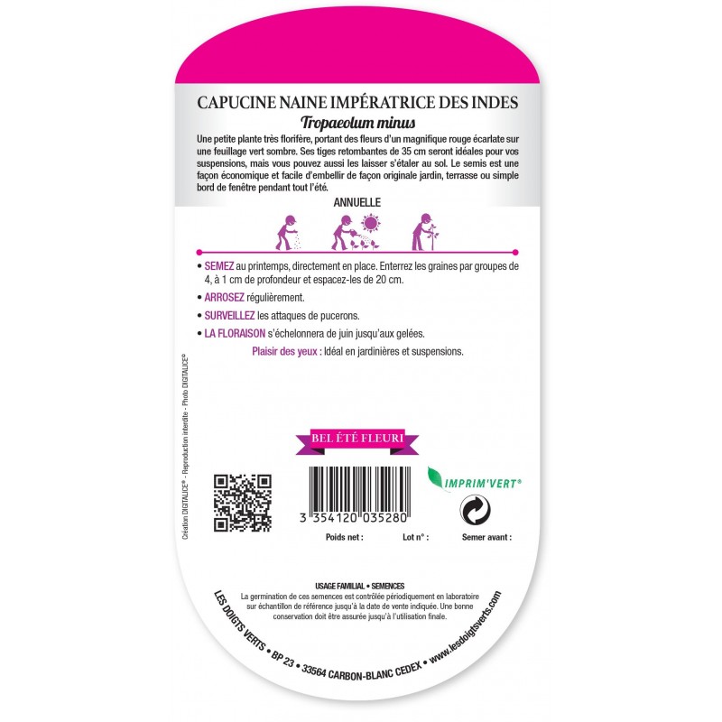 Cette capucine est une petite plante très florifère, portant des fleurs d’un magnifique rouge écarlate sur une feuillage vert sombre. Ses tiges retombantes de 35 cm seront idéales pour vos suspensions, mais vous pouvez aussi les laisser s’étaler au sol. Le semis est une façon économique et facile d’embellir de façon originale jardin, terrasse ou simple bord de fenêtre pendant tout l’été.