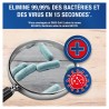 - Elimination des taches difficiles et désinfection : laisser agir le temps nécessaire (voir les propriétés) avant d’essuyer.