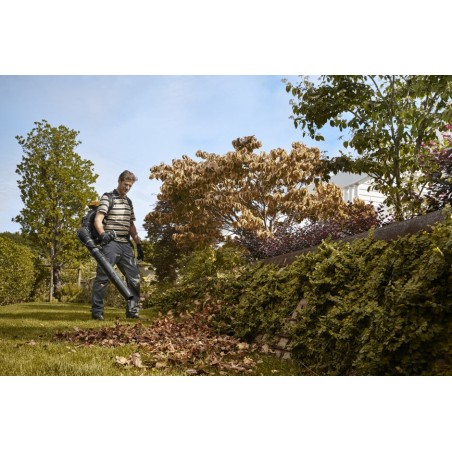 Ce souffleur de feuilles à dos est équipé d'un moteur de 75,6 cm³, d'un flexible réglable et d'une poignée simple avec commandes intégrées. Débit d'air maximal de 25 m³/min.