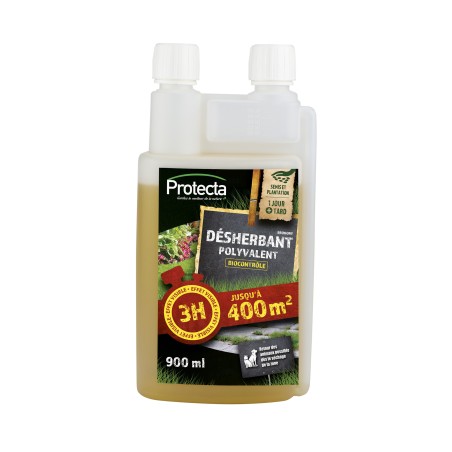 Le désherbant polyvalent Protecta est un désherbant idéal pour détruire les mauvaises herbes et les mousses du jardin. Sa forte concentration garantit une efficacité rapide avec un effet visible dès 2-3h après l’application. Composé de principes actifs 100% d’origine végétale, il permet aux animaux domestiques de revenir sur la surface traitée dès que le produit est sec. Enfin, le désherbant Protecta permet le semis et la plantation dans les zones traitées seulement un jour après l’application.