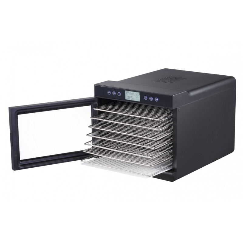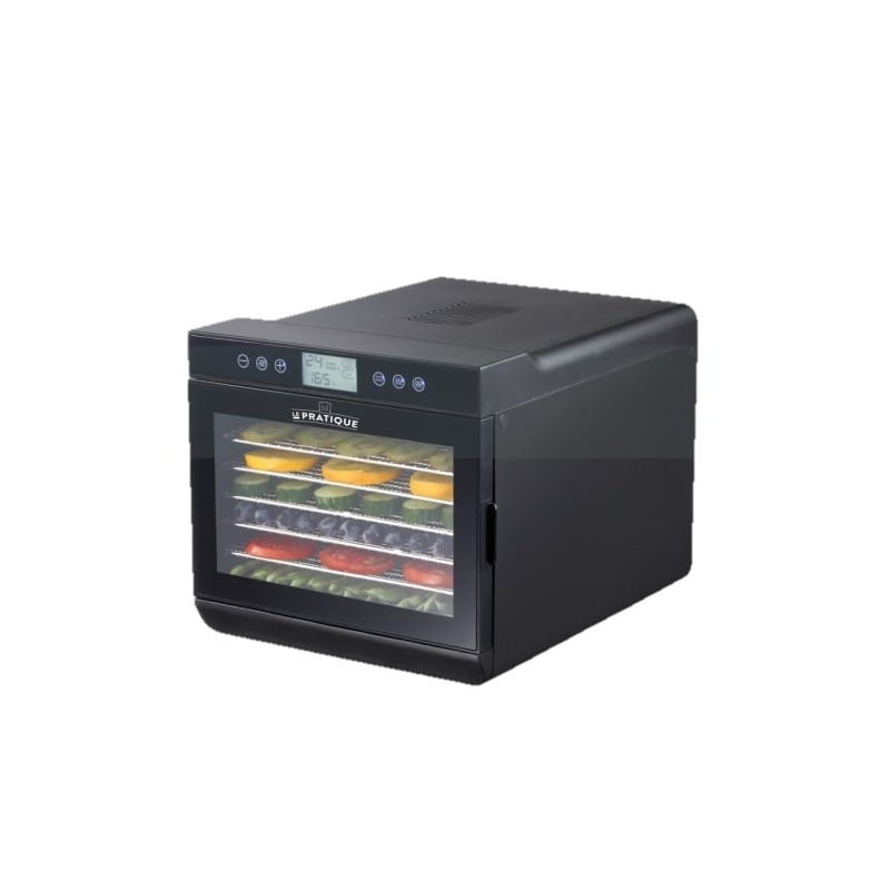 Ce déshydrateur est parfait pour conserver les aliments plus longtemps, de manière naturelle en conservant les valeurs nutritives. C'est une manière saine de conserver et déguster les aliments. L'appareil permet de sécher tous types de fruits, de légumes, de viandes, de volailles ou de poissons pour les savourer partout en toute saison ! La nourriture sera facile à transporter pour les voyages, pique-niques, goûters etc. Vous le programmerez simplement avec le thermostat variable de 35°C à 75°C par pallier de 5°C et l'utilisation est programmable par tranche de 30 minutes jusqu’à 24 heures.