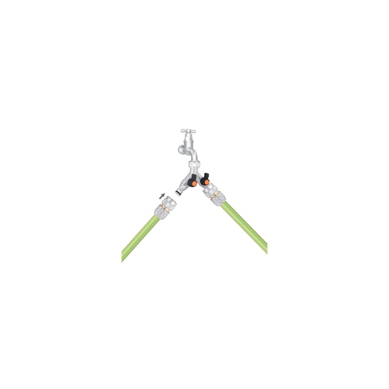 Prise à deux voies en laiton chromé. Elle permet le raccord de deux lignes équipées de raccords automatiques Quick-Click à une unique prise d’eau. Robinets à réglage indépendant. Installation sur robinet avec filet de 20-27 mm.