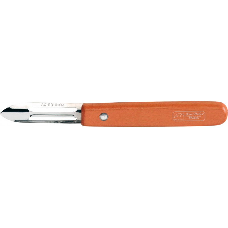 Couteau éplucheur avec lame demi-soie en acier inoxydable français de haute qualité. Manche tradition 2 rivets en hêtre naturel issu de forêts françaises, avec sérigraphie laser à l'effigie de la marque Jean Dubost.