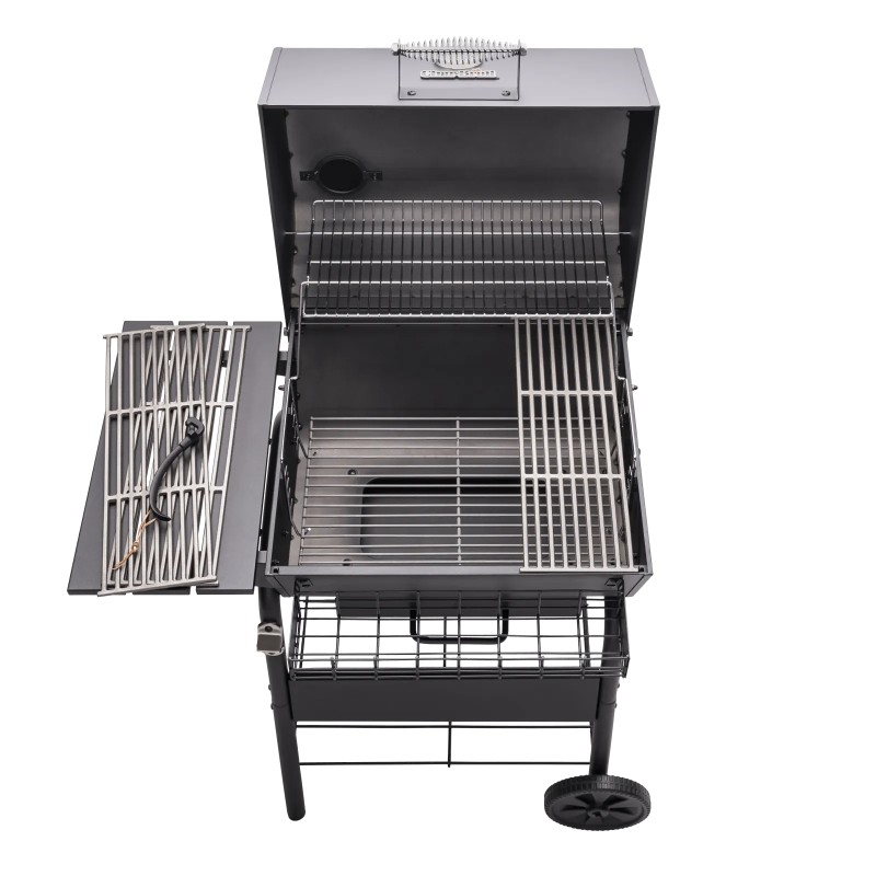 Large tablette pour un maximum d'espace et de praticité :  La tablette latérale est munie de crochets pour garder vos accessoires à portée de main, la tablette inférieure vous offre également une surface de travail et de rangement supplémentaire. Le Charcoal L est doté d'une tablette frontale supplémentaire facilement accessible.