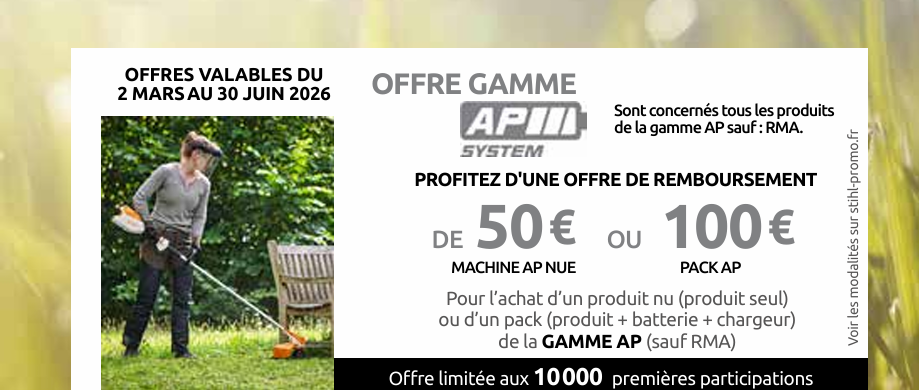 Cette offre est valable pour l'achat d'une tronçonneuse, d'un taille-haies, d'un coupe-bordures, d'une débroussailleuse, d'un aspirateur, d'un sécateur, d'un combi-système, d'un souffleur, d'un scarificateur, d'un pulvérisateur ou d'une perche d'élagage de la gamme AP SYSTEM.