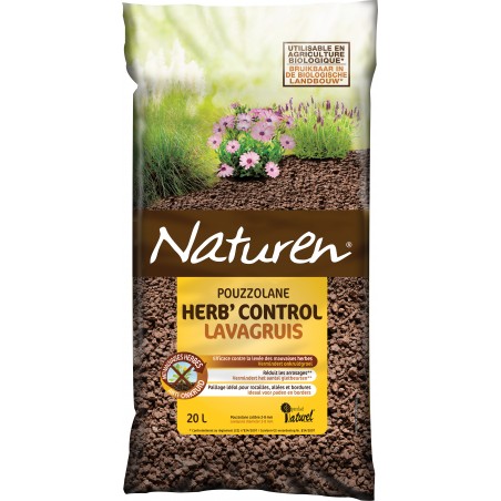 Herb'Control pouzzolane : Ce produit est idéal pour les rocailles, allées et bordures. Ce produit est 100% naturel constitué de projections volcaniques. Le paillage gardera son aspect pendant plusieurs années. Il pourra être mélangé au sol pour aérer la terre et déposé au fond des pots et jardinières pour drainer. Le paillage Pouzzolane Herb'Control forme une barrière à la lumière. La terre reste donc propre plus longtemps puisque le manque de lumière limite la pousse des mauvaises herbes. La pouzzolane Naturen a un calibre très fin. Elle forme une couche plus compacte que la pouzzolane d'un calibre supérieur, pour une meilleure efficacité.