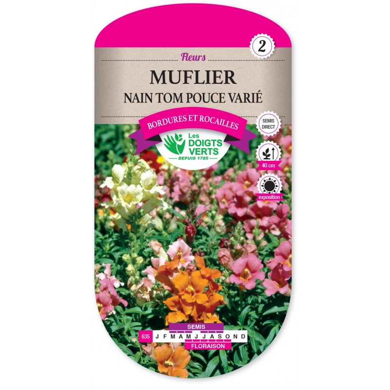Le Muflier nain Tom Pouce varié est une plante appelée également “gueule de loup”, très florifère, aux coloris vifs et variés. La floraison durera du printemps à l’automne si vous prenez soin de couper les tiges ayant fini de fleurir. Le semis permet d’obtenir un grand nombre de plantes de façon économique et facile.