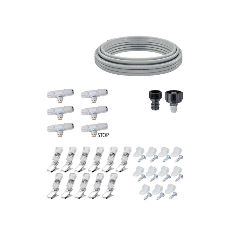 Le kit (composé de 7,5 m de tuyau, 6 micro-brumisateurs, raccords et clips de fixation) peut être facilement accroché à des stores, des tonnelles et des parasols et raccordé au robinet (moyennant rallonge de raccord non fournie).