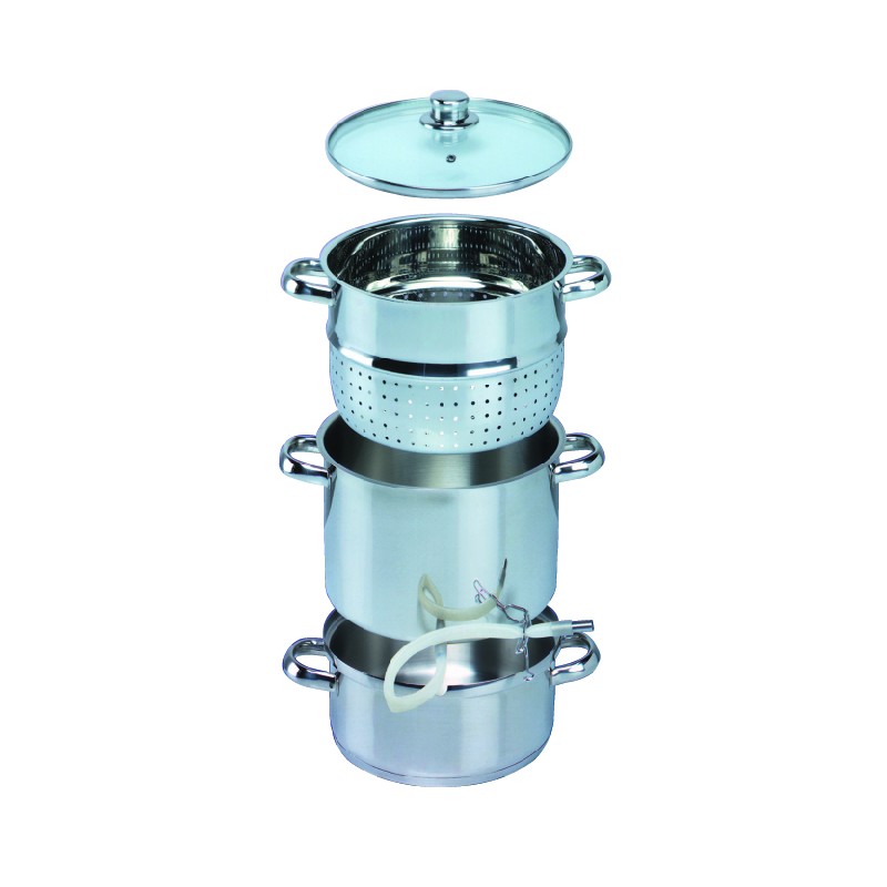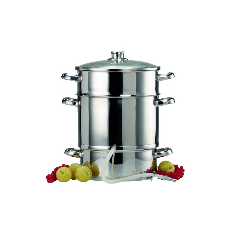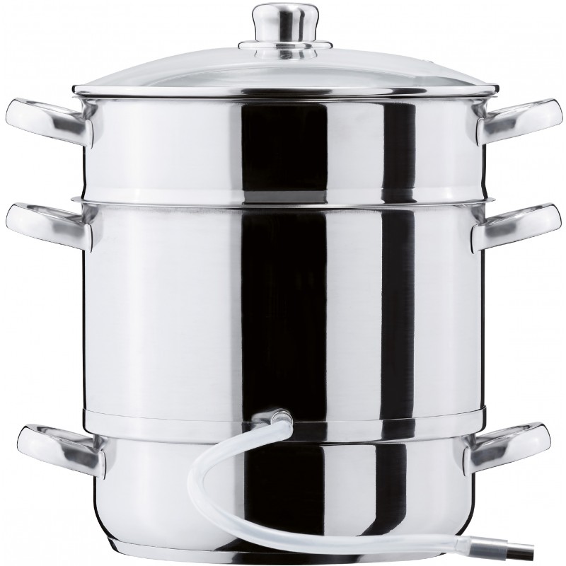 Permet d’extraire le jus des fruits à l’aide de la vapeur et de les conserver dans des bouteilles fraicheurs ou de type limonades 1 an. Idéal également pour les gelées et les confitures. Remplir d’eau le récipient D, mettre les fruits dans la passoire B : le jus coule dans le faitout C et est récupéré à l’aide du tuyau lorsque le feu est éteint. Les bouteilles doivent être remplies aussitôt afin que le jus se stérilise. Toutes les pièces se lavent au lave-vaisselle.