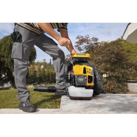 Ce souffleur de feuilles à dos est équipé d'un moteur de 75,6 cm³, d'un flexible réglable et d'une poignée simple avec commandes intégrées. Débit d'air maximal de 25 m³/min.