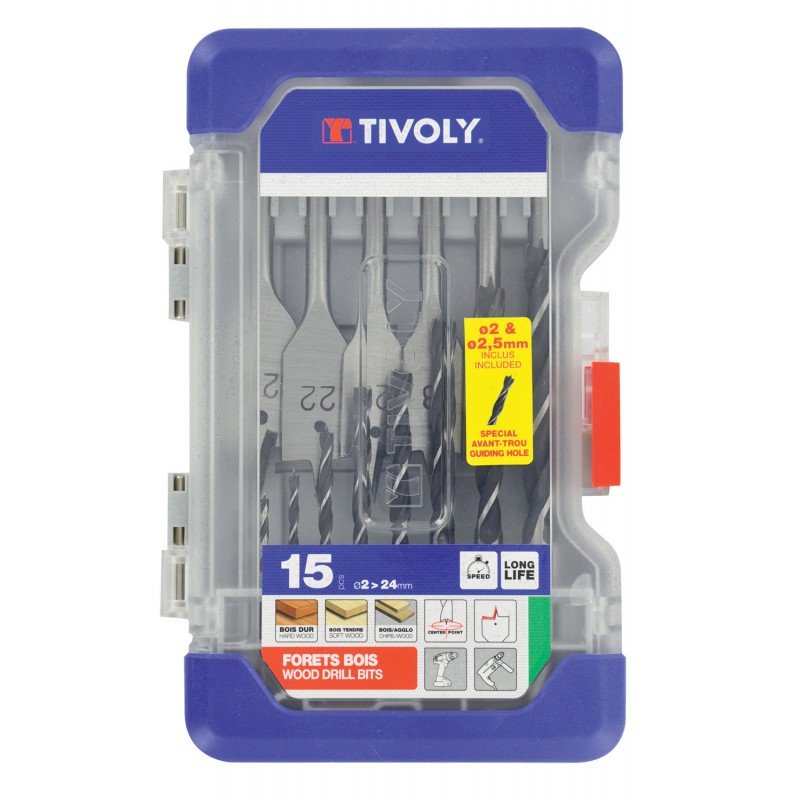 COFFRET 9 FORETS BOIS 3 POINTES Ø2 A 10MM + 6 MECHES BOIS PLATES Ø14 A 24MM - TIVOLY