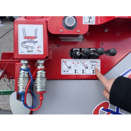 - Tapis hydraulique 5 mètres : télescopique en 3 parties, dépliage hydraulique en 2 temps, tension hydraulique de la bande, réglage manuel d'angle de la hauteur du tapis, orientation gauche droite hydraulique (+/-15°), vitesse d'évacuation variable, commande hydraulique marche avant / arrière