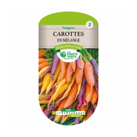 Mélange original de variété de carottes aux couleurs diverses, aux saveurs douces. Les carottes sont riches en bêta carotène et apporte de la vitamine A. Mélange composé de 1/3 carotte Purple Haze, 1/3 carotte jaune du doubs et 1/3 carotte Nantaise race Garo.